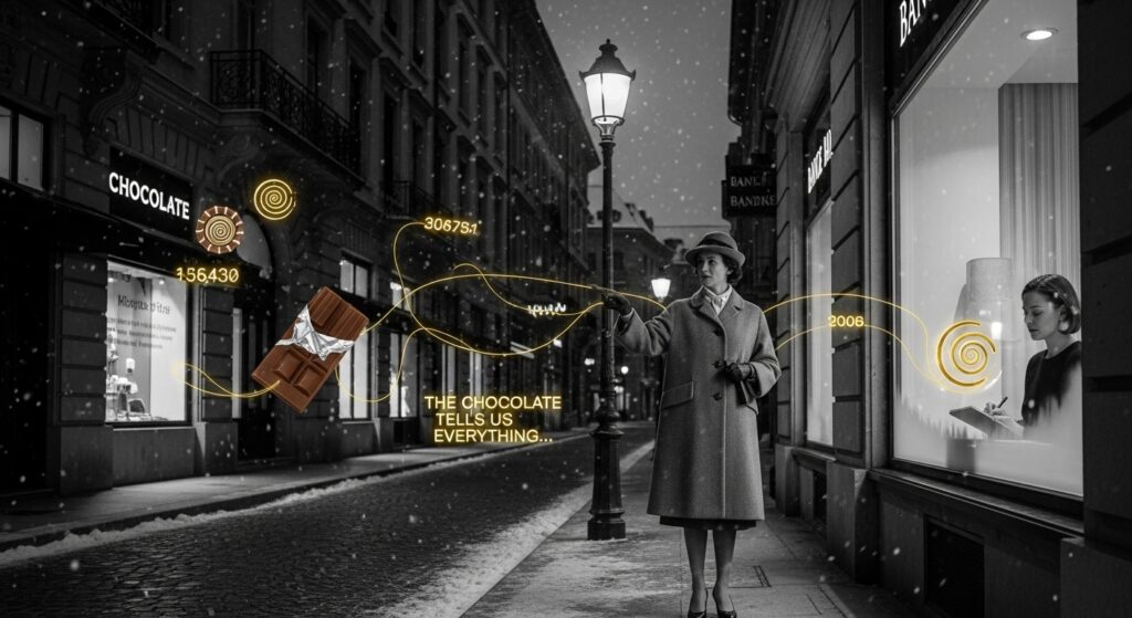 Tuesday morning, 7:23 AM. Henri’s secretary, Marie, finds him slumped over his desk, stone cold dead, clutching that precious chocolate square. But here’s the thing – the chocolate had a spiral pressed into it. Not the company logo. A deliberate pattern, like someone had used it as a wax seal.