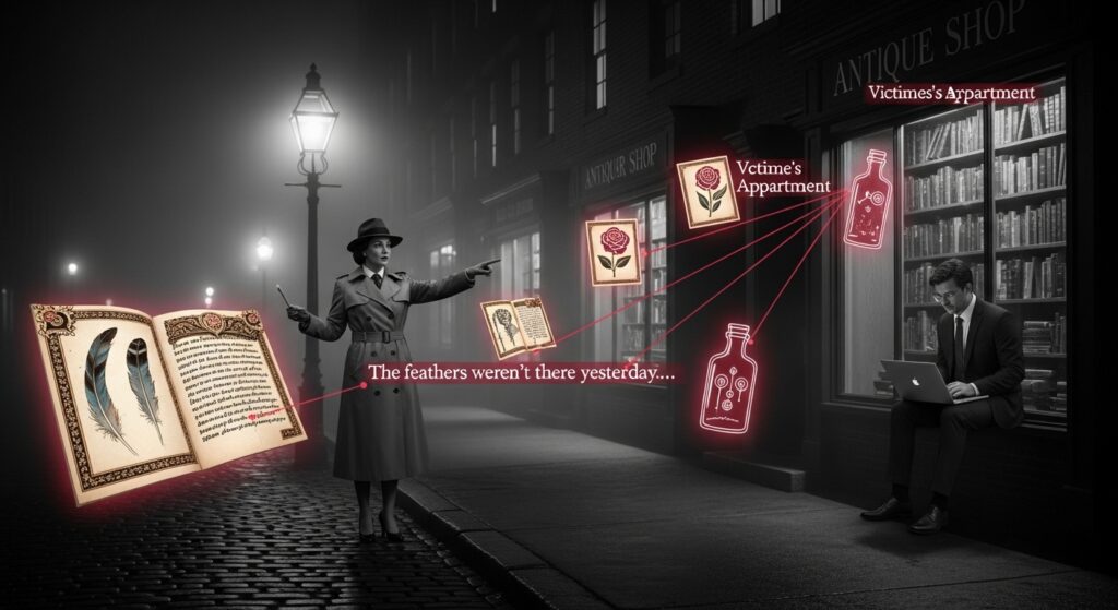 Friday morning, 8:15 AM. Her assistant Thomas finds her face-down on a $50,000 illuminated manuscript – a one-of-a-kind medieval text about poisons, ironically enough. The manuscript’s gold-leaf borders were smeared with blood, but here’s the strange part: the killer had added new decorations to the medieval borders. Fresh ink. Fresh patterns. Feathers that weren’t there before.