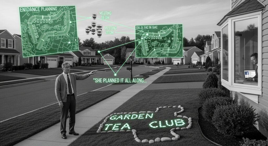 Frank Peterson, the local mailman who’d walked the same route for 20 years until Martha’s cul-de-sacs added three miles to his daily delivery. Frank had started leaving passive-aggressive notes in Martha’s mailbox. Not threats, just corrections to her grammar and suggestions that she consider retiring to Florida.