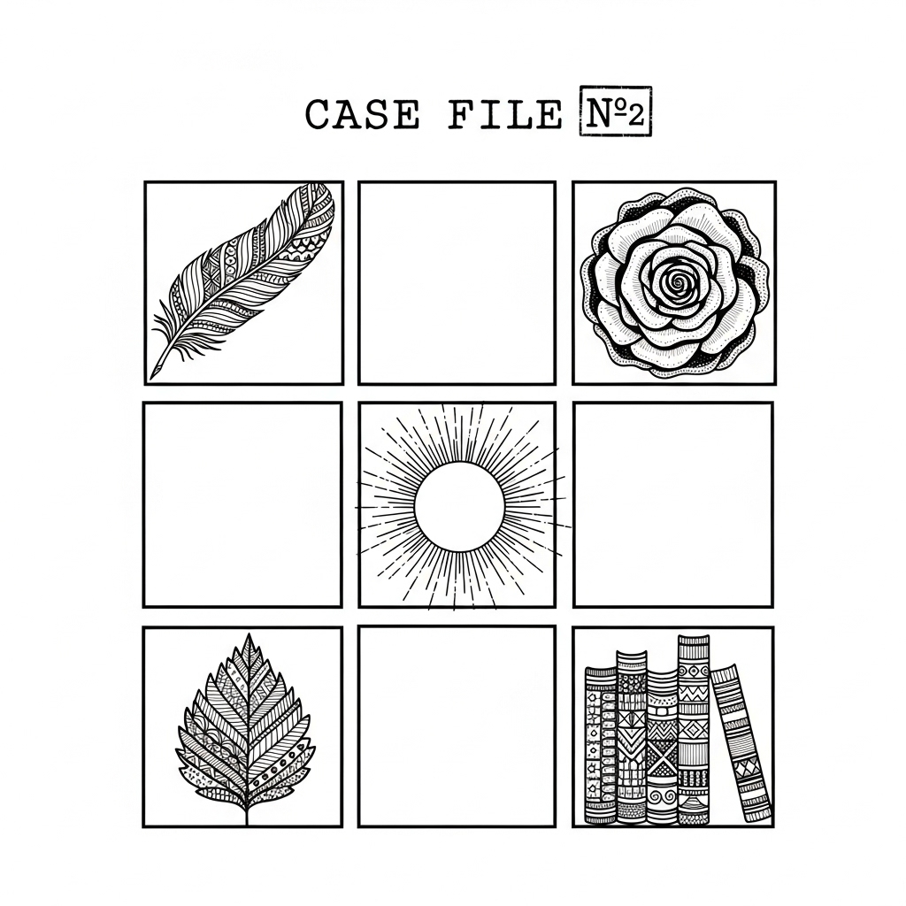 First empty square (top-center): Write “VC” here. These initials were hidden in the new feather pattern the killer drew on the manuscript – worked into the decorative barbs.
