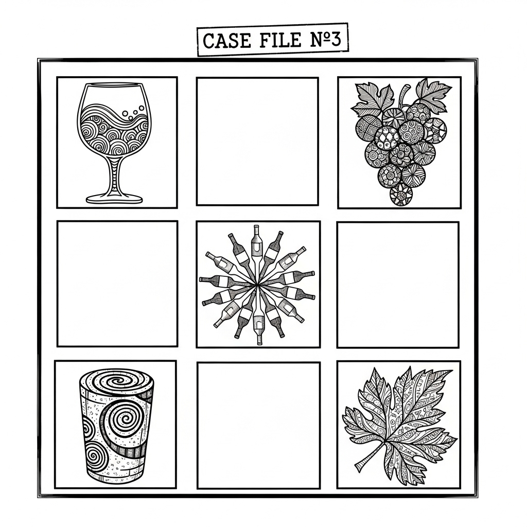 First empty square (top-center): Draw wine glass legs – three curved lines running down. This matches what Richard saw in his final glass.
