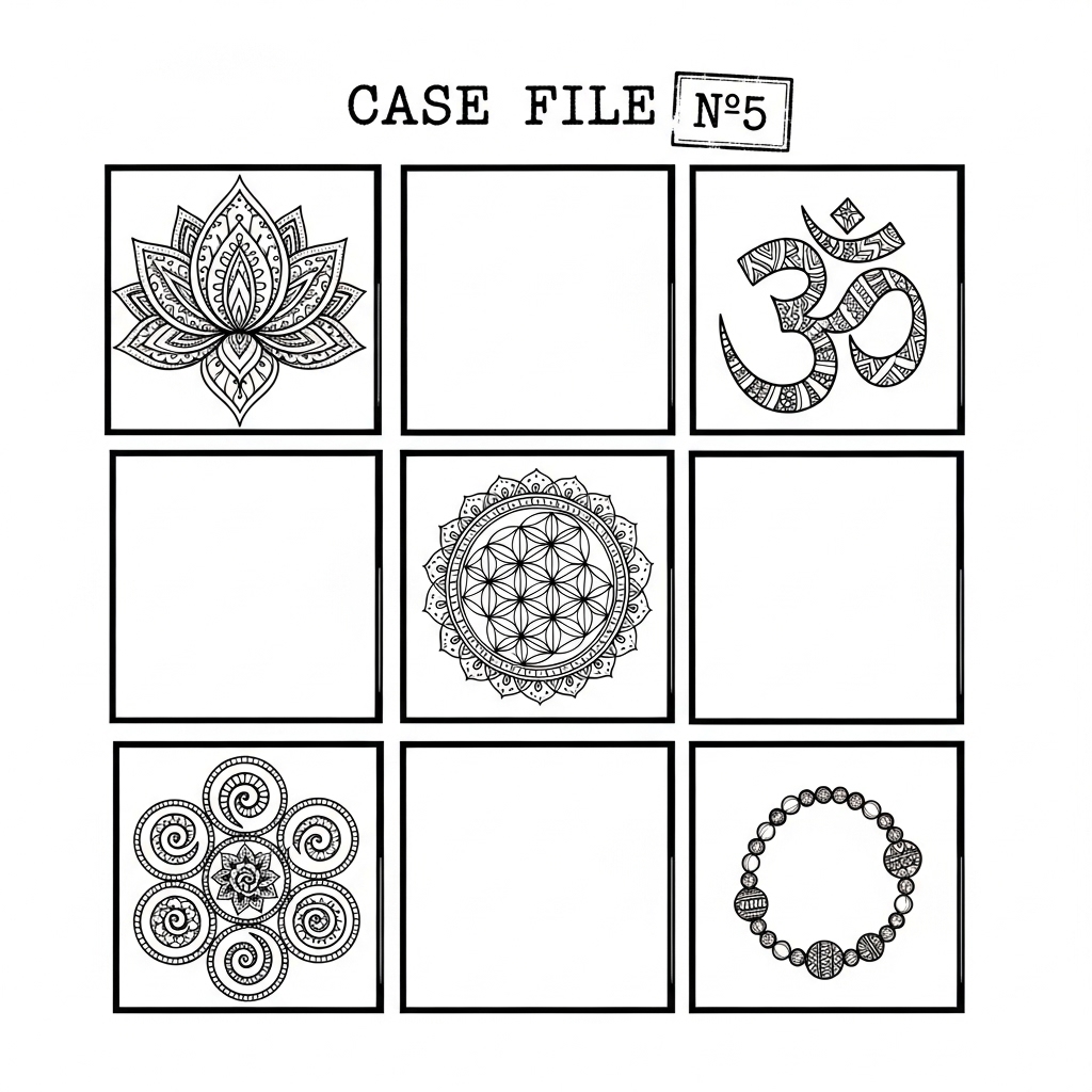 Look at your case file grid. That lotus pattern? It’s exactly like the mandala around Ananda’s body, but with one crucial difference.