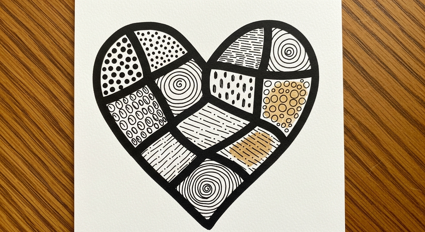 I found it by accident. One night I traced a heart on scrap paper and filled it with simple lines. I’m not artistic. But something happened while I drew. My breathing slowed. The room got quiet. I felt… calm. Seven minutes later, I had a pretty little heart staring back at me.
